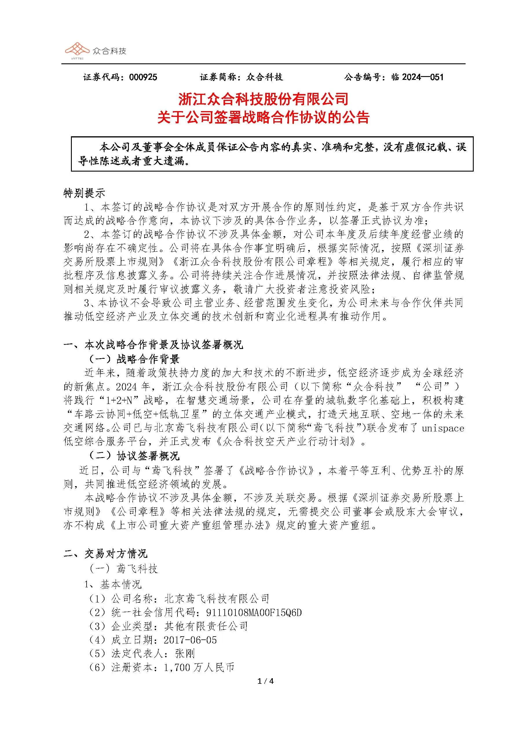 6月27日,眾合科技發(fā)布公告稱,與北京鳶飛科技有限公司(以下簡(jiǎn)稱“鳶飛科技”)正式簽署了戰(zhàn)略合作協(xié)議。根據(jù)協(xié)議,雙方將展開多方位深度合作,涵蓋技術(shù)、股權(quán)、應(yīng)用場(chǎng)景和渠道資源等多個(gè)關(guān)鍵領(lǐng)域,共同推動(dòng)低空經(jīng)濟(jì)領(lǐng)域的創(chuàng)新與發(fā)展,實(shí)現(xiàn)資源共享、優(yōu)勢(shì)互補(bǔ)、互利共贏。