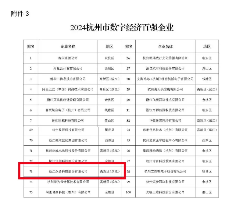 近日,根據(jù)市政府統(tǒng)一部署,在杭州市經(jīng)濟(jì)和信息化局等有關(guān)部門的支持下,各行業(yè)協(xié)會(huì)、廣大企業(yè)的參與下,杭州市工業(yè)經(jīng)濟(jì)聯(lián)合會(huì)、杭州市企業(yè)聯(lián)合會(huì)、杭州市企業(yè)家協(xié)會(huì)聯(lián)合發(fā)布了“2024杭州市數(shù)字經(jīng)濟(jì)百強(qiáng)企業(yè)榜單”。眾合科技憑借在數(shù)字經(jīng)濟(jì)領(lǐng)域的卓越表現(xiàn)榮耀上榜,這是公司自2022年榜單設(shè)立以來連續(xù)第三年獲此殊榮,彰顯了其在數(shù)字經(jīng)濟(jì)浪潮中的強(qiáng)勁實(shí)力和領(lǐng)先地位。