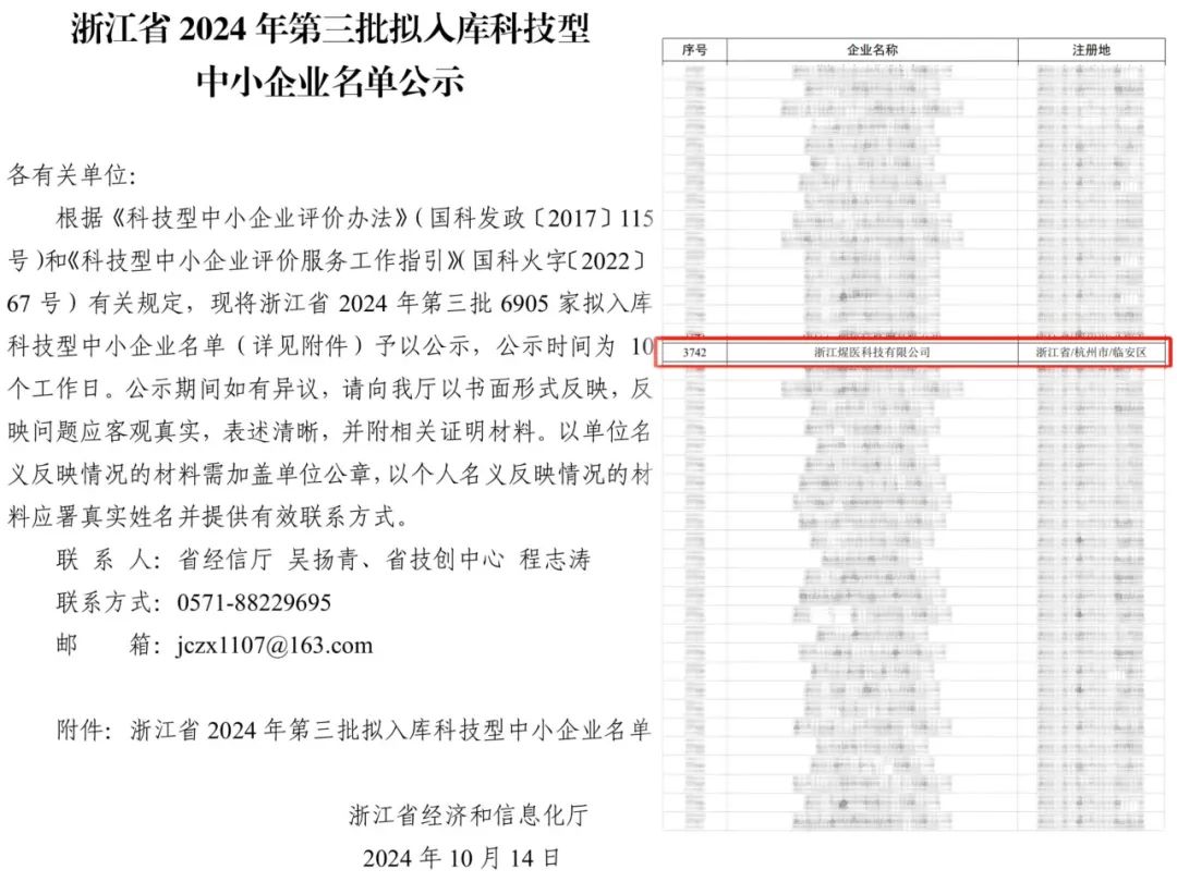 近日,浙江省經(jīng)濟和信息化廳印發(fā)《浙江省科技廳關于2024年第三批擬入庫科技型中小企業(yè)名單的公示》。眾合科技旗下浙江煋醫(yī)科技有限公司被認定為“國家科技型中小企業(yè)”,并被納入2024年第三批國家科技型中小企業(yè)信息庫。