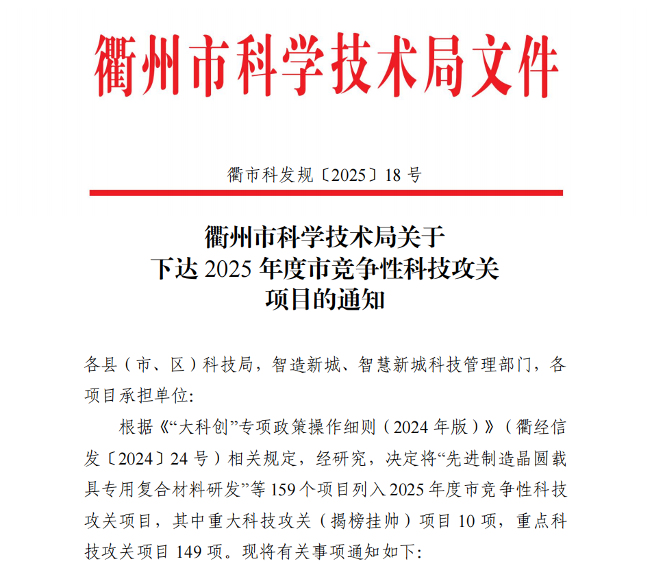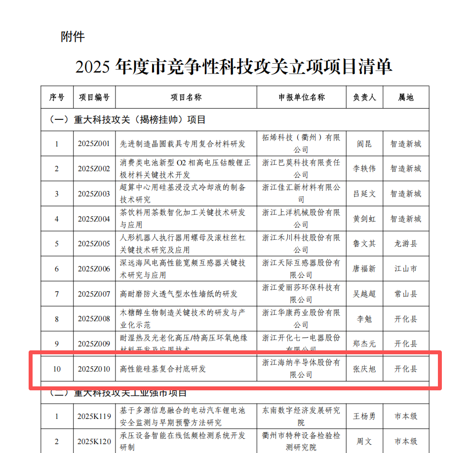 日前,衢州市科學(xué)技術(shù)局發(fā)布《衢州市科學(xué)技術(shù)局關(guān)于下達(dá)2025年度市競(jìng)爭(zhēng)性科技攻關(guān)項(xiàng)目的通知》(衢市科發(fā)規(guī)〔2025〕18號(hào)),浙江海納半導(dǎo)體股份有限公司(以下簡(jiǎn)稱(chēng)“海納股份”)憑借“高性能硅基復(fù)合襯底研發(fā)”項(xiàng)目,成功入選2025年度衢州市重大科技攻關(guān)(揭榜掛帥)項(xiàng)目,標(biāo)志著海納股份在半導(dǎo)體襯底材料領(lǐng)域的技術(shù)創(chuàng)新能力、產(chǎn)業(yè)化潛力獲得市級(jí)主管部門(mén)的權(quán)威認(rèn)可。